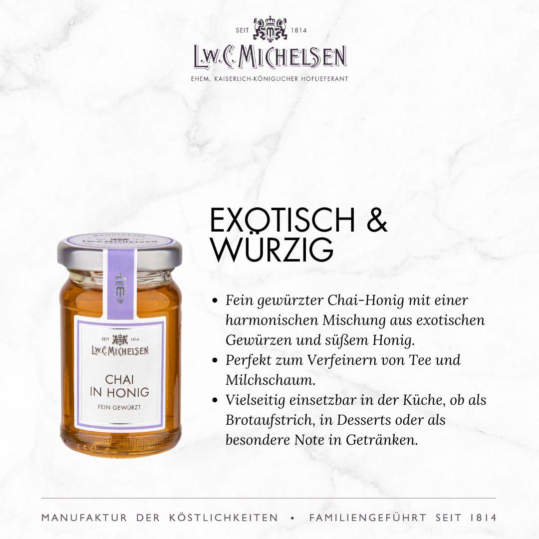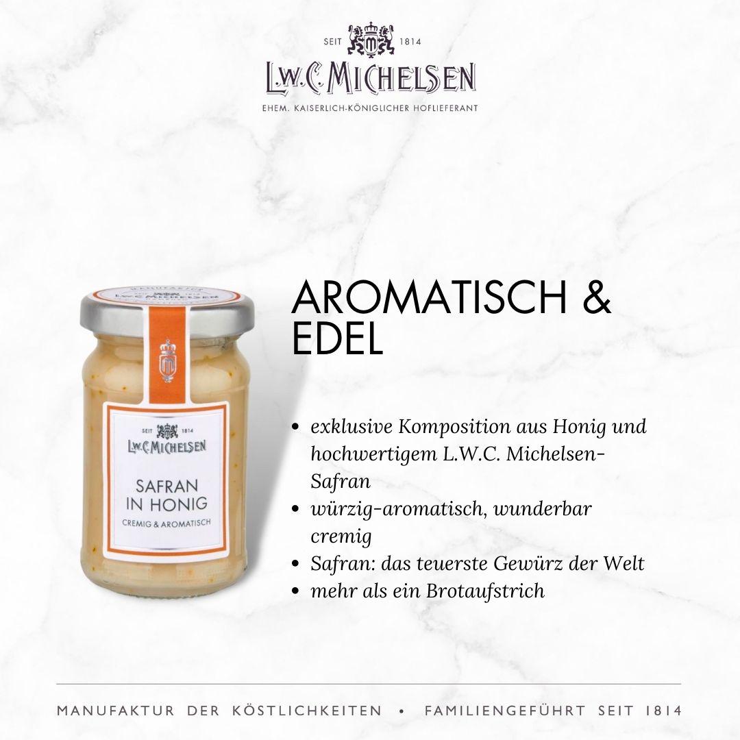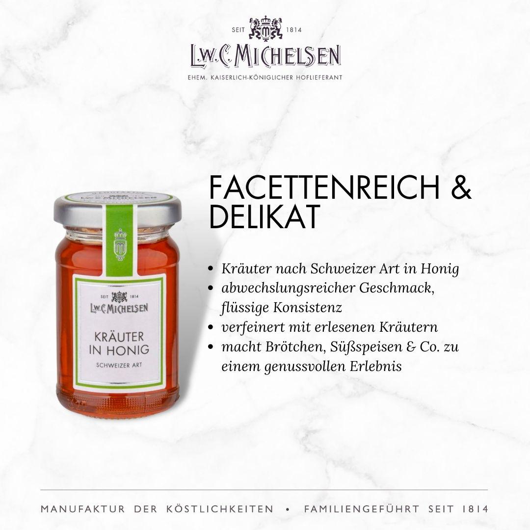 Mit einem breiten Sortiment an exquisiten Feinkostprodukten, Marmeladen, Honigen, Likören und Delikatessen aus aller Welt begeistert L.W.C. Michelsen Feinschmecker, Gourmets und Genießer gleichermaßen. Die Marke steht für traditionelle Rezepturen, hochwertige Zutaten und innovative Geschmackskompositionen, die immer wieder überraschen und Freude bereiten. Auch heute noch werden viele Produkte nach originalen Rezepturen hergestellt – sorgfältig und mit Liebe zum Detail.