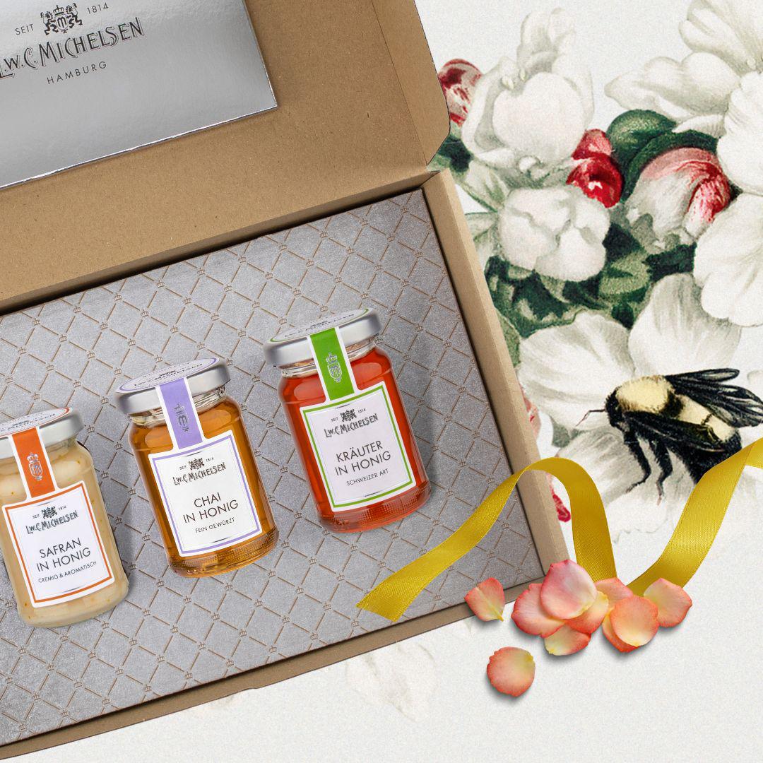 Entdecken Sie unser 3er Set Kräuterhonig in einer charmanten Geschenkbox – ein wahres Fest für die Sinne. Seit 1814 steht unser Hamburger Unternehmen für Tradition und Qualität in der Feinkostherstellung. Diese exquisite Kollektion umfasst drei einzigartige Honigsorten: Kräuter in Honig, Thymian in Honig und Safran in Honig. Jede Sorte bietet ein unvergleichliches Geschmackserlebnis, das durch die sorgfältige Auswahl hochwertiger Zutaten und die traditionelle Herstellung garantiert wird.