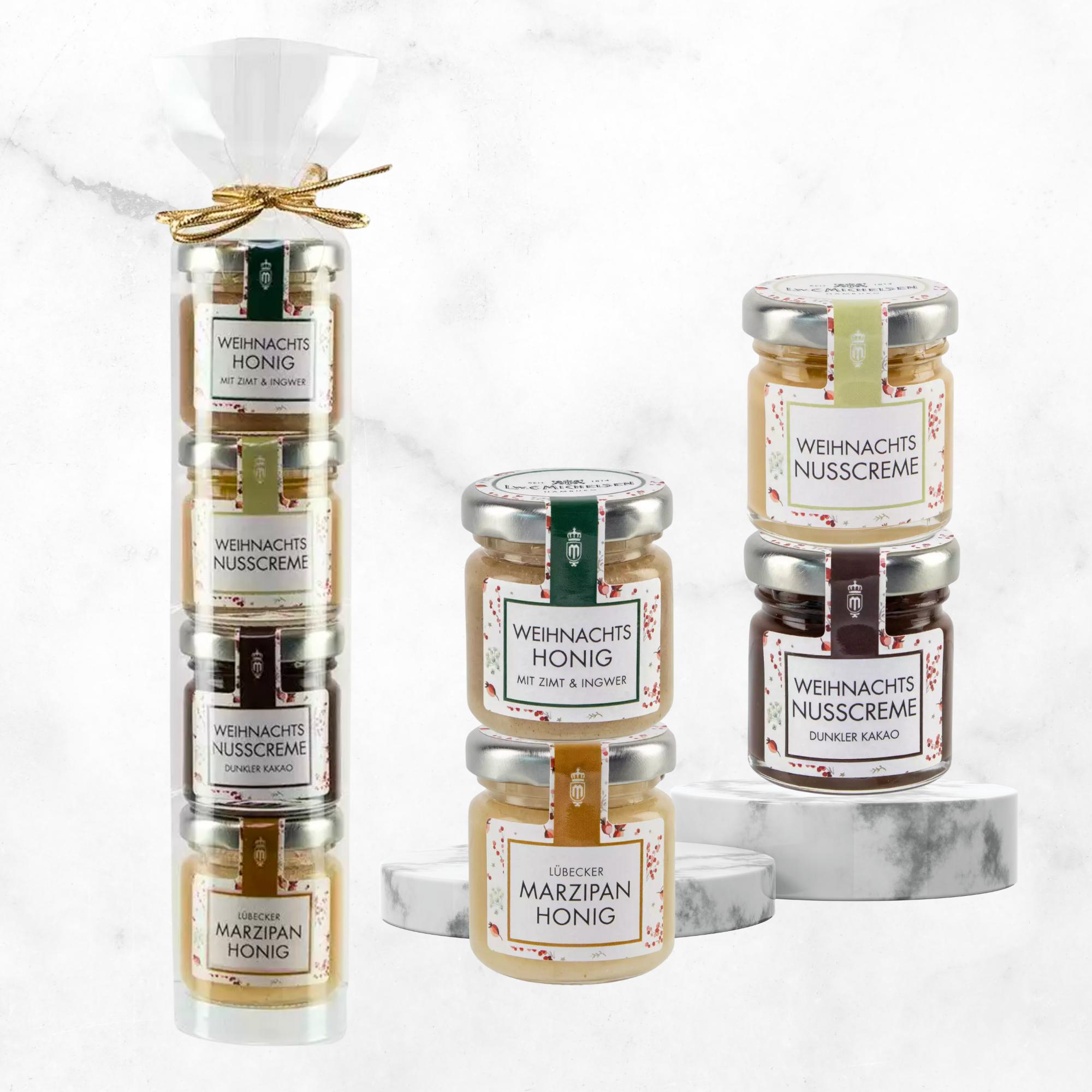- Präsente-Türmchen mit vier Portionsgläsern: Honig & Zimt, Honig & Marzipan, Haselnusscreme, Haselnuss mit dunklem Kakao.