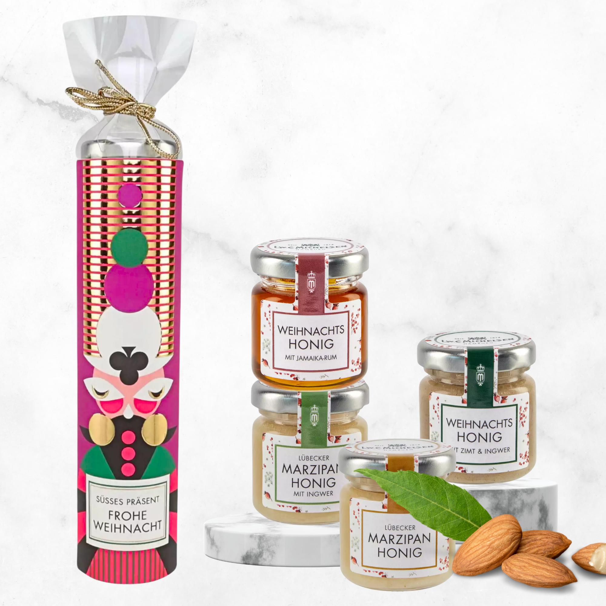 Entdecken Sie das 4er Turm Weihnachtsmann Honigpräsent von L.W.C. Michelsen – ein wahres Fest für die Sinne und das perfekte Geschenk für Honigliebhaber. Dieses charmante Präsente-Türmchen enthält vier exquisite Honigzubereitungen à 50 Gramm in den verlockenden Geschmacksrichtungen Honig & Rum, Honig & Zimt, Honig & Marzipan und Honig & Ingwer. Jede Sorte ist ein kleines Meisterwerk, das durch die sorgfältige Auswahl der Zutaten und die traditionelle Herstellungsmethode besticht.