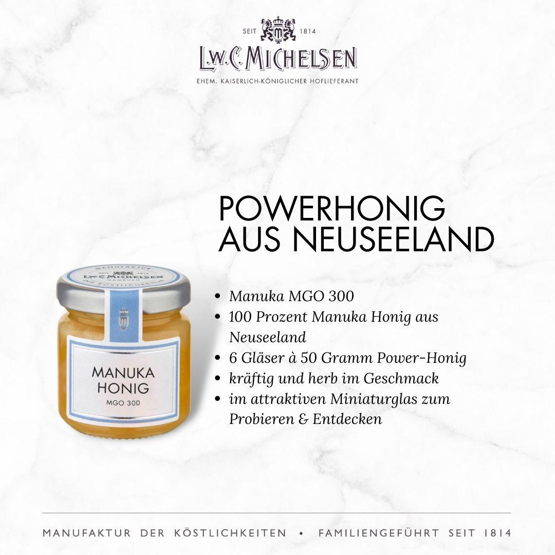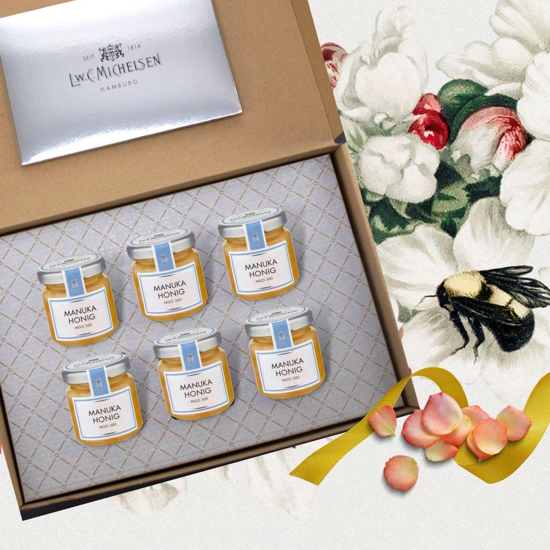 - Sechs Gläser à 50 Gramm Manuka Honig in einer charmanten Geschenkbox