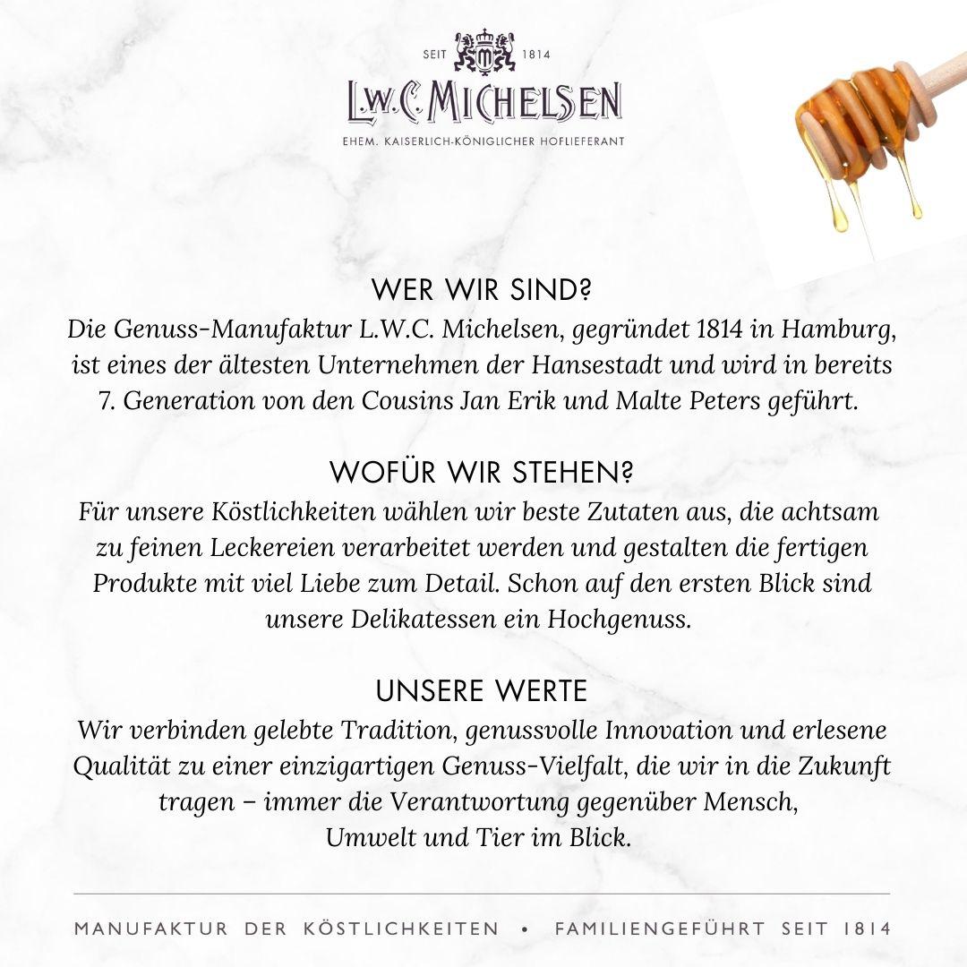 Gesamtinhalt: 6 Einzelpackungen Linden-Honig Inhalt: 50,00 g Zutaten: Honig Allergene: Keine Spurenkennzeichnung Allergene: Keine Nährwertangaben pro 100g Energiegehalt: 1.283 kJ/302 kcal Fett: 0 g gesättigte Fettsäuren: 0 g Kohlenhydrate: 75 g davon Zucker: 74 g Eiweiß: 0 g Salz: 0 g VerpflichtendeKennzeichnung: Mischung von Honig aus EU- und Nicht-EU-Ländern. Honig ist naturbelassene Rohkost und für Kinder unter 1 Jahr ungeeignet. Verantwortlicher Lebensmittelunternehmer: L.W.C. Michelsen GmbH, Michelsenweg 1, 20537 Hamburg, Deutschland *** Sonnenblumen-Honig Inhalt: 50,00 g Zutaten: Honig Allergene: Keine Spurenkennzeichnung Allergene: Keine Nährwertangaben pro 100g Energiegehalt: 1.282 kJ/302 kcal Fett: 0 g gesättigte Fettsäuren: 0 g Kohlenhydrate: 75 g davon Zucker: 74 g Eiweiß: 0 g Salz: 0 g VerpflichtendeKennzeichnung: Mischung von Honig aus EU - und Nicht-EU-Ländern. Honig ist naturbelassene Rohkost und für Kinder unter 1 Jahr ungeeignet. Verantwortlicher Lebensmittelunternehmer: L.W.C. Michelsen GmbH, Michelsenweg 1, 20537 Hamburg, Deutschland *** Wald-Honig Inhalt: 50,00 g Zutaten: Honig Allergene: Keine Spurenkennzeichnung Allergene: Keine Nährwertangaben pro 100g Energiegehalt: 1.283 kJ/302 kcal Fett: 0 g gesättigte Fettsäuren: 0 g Kohlenhydrate: 75 g davon Zucker: 75 g Eiweiß: 0 g Salz: 0 g VerpflichtendeKennzeichnung: Mischung von Honig aus EU - und Nicht-EU-Ländern. Honig ist naturbelassene Rohkost und für Kinder unter 1 Jahr ungeeignet. Verantwortlicher Lebensmittelunternehmer: L.W.C. Michelsen GmbH, Michelsenweg 1, 20537 Hamburg, Deutschland *** Kaffeeblüten-Honig Inhalt: 50,00 g Zutaten: Honig Allergene: Keine Spurenkennzeichnung Allergene: Keine Nährwertangaben pro 100g Energiegehalt: 1.283 kJ/302 kcal Fett: 0 g gesättigte Fettsäuren: 0 g Kohlenhydrate: 75 g davon Zucker: 75 g Eiweiß: 0 g Salz: 0 g VerpflichtendeKennzeichnung: Mischung von Honig aus Nicht-EU-Ländern. Honig ist für Kinder unter 12 Monaten nicht geeignet. Verantwortlicher Lebensmittelunternehmer: L.W.C. Michelsen GmbH, Michelsenweg 1, 20537 Hamburg, Deutschland *** Orangenblüten-Honig Inhalt: 50,00 g Zutaten: Honig Allergene: Keine Spurenkennzeichnung Allergene: Keine Nährwertangaben pro 100g Energiegehalt: 1.283 kJ/302 kcal Fett: 0 g gesättigte Fettsäuren: 0 g Kohlenhydrate: 75 g davon Zucker: 74 g Eiweiß: 0 g Salz: 0 g VerpflichtendeKennzeichnung: Mischung von Honig aus EU- und Nicht-EU-Ländern. Honig ist naturbelassene Rohkost und für Kinder unter 1 Jahr ungeeignet. Verantwortlicher Lebensmittelunternehmer: L.W.C. Michelsen GmbH, Michelsenweg 1, 20537 Hamburg, Deutschland *** Akazien-Honig Inhalt: 50,00 g Zutaten: Honig Allergene: Keine Spurenkennzeichnung Allergene: Keine Nährwertangaben pro 100g Energiegehalt: 1.283 kJ/302 kcal Fett: 0 g gesättigte Fettsäuren: 0 g Kohlenhydrate: 75 g davon Zucker: 74 g Eiweiß: 0 g Salz: 0 g VerpflichtendeKennzeichnung: Honig ist naturbelassene Rohkost und für Kinder unter 1 Jahr ungeeignet. Verantwortlicher Lebensmittelunternehmer: L.W.C. Michelsen GmbH, Michelsenweg 1, 20537 Hamburg, Deutschland |