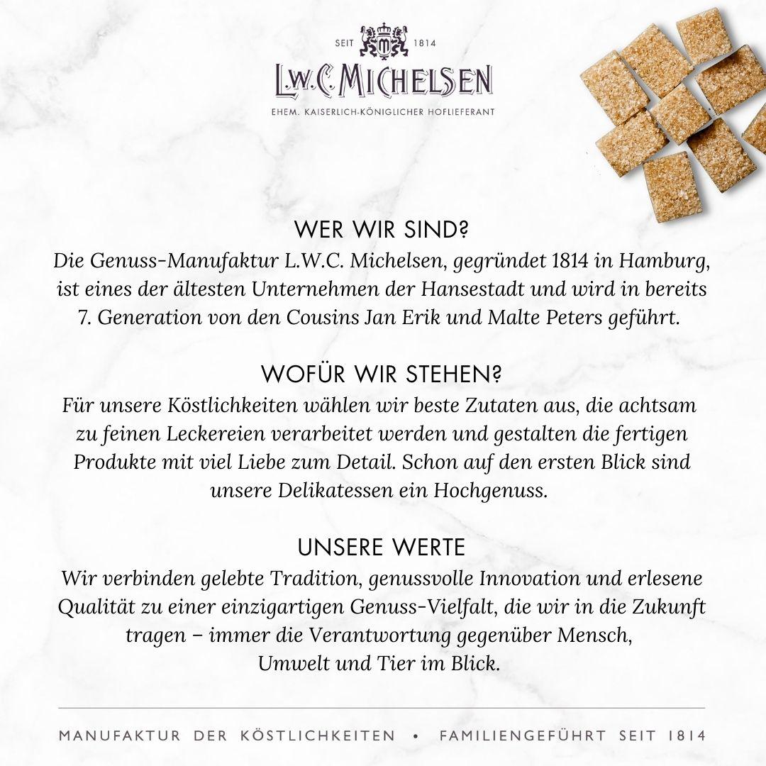 Gesamtinhalt: 6 Einzelpackungen Zubereitung aus Gin-Lemon-Likör und Kandiszucker Inhalt: 50,00 g Zutaten: 64% Kandiszucker, 36% Zubereitung aus Gin-Lemon-Likör(15% vol.) (Invertzuckersirup, Neutralalkohol , Wasser, natürliches Aroma, natürliches Limetten-Aroma, natürliches Zitronen-Aroma). Allergene: Keine Spurenkennzeichnung Allergene: Keine Nährwertangaben pro 100g Energiegehalt: 1.565 kJ/369 kcal Fett: 0 g gesättigte Fettsäuren: 0 g Kohlenhydrate: 86 g davon Zucker: 86 g Eiweiß: 0 g Salz: 0 g Verantwortlicher Lebensmittelunternehmer: L.W.C. Michelsen GmbH, Michelsenweg 1, 20537 Hamburg, Deutschland *** Kandiszucker in Irish Malt Whiskey-Likörzubereitung Inhalt: 50,00 g Zutaten: Kandiszucker (64 %), Irish Malt Whiskey-Likörzubereitung (35,5 %) [Invertzuckersirup, Irish Malt Whiskey (25 %, 60 % vol.), Wasser, Whiskey-Aroma], Karamellzuckersirup (0,5 %). Allergene: Keine Spurenkennzeichnung Allergene: Keine Nährwertangaben pro 100g Energiegehalt: 1.566 kJ/369 kcal Fett: 0 g gesättigte Fettsäuren: 0 g Kohlenhydrate: 86 g davon Zucker: 86 g Eiweiß: 0 g Salz: 0 g VerpflichtendeKennzeichnung: Ein Alkoholgehalt muss nur angegeben werden, wenn es sich um ein Getränk handelt. Das ist bei diesem Artikel nicht der Fall. Einen Hinweis, ob der Artikel Alkohol enthält, ist über die Verkehrsbezeichnung erkennbar. Dieser Artikel ist dennoch für Kinder und Jugendlichen unter 16 Jahren nicht geeignet. Verantwortlicher Lebensmittelunternehmer: L.W.C. Michelsen GmbH, Michelsenweg 1, 20537 Hamburg, Deutschland *** Zubereitung aus Kandiszucker und Likör verfeinert mit Jamaika-Rum Inhalt: 50,00 g Zutaten: 64% Kandiszucker, 36% Zubereitung aus Likör verfeinert mit Jamaika-Rum (Invertzuckersirup, 12% Jamaika-Rum (92,8% vol.), Wasser, Karamell). Allergene: Keine Spurenkennzeichnung Allergene: Keine Nährwertangaben pro 100g Energiegehalt: 1.481 kJ/349 kcal Fett: 0 g gesättigte Fettsäuren: 0 g Kohlenhydrate: 82 g davon Zucker: 82 g Eiweiß: 0 g Salz: 0,03 g VerpflichtendeKennzeichnung: Ein Alkoholgehalt muss nur angegeben werden, wenn es sich um ein Getränk handelt. Das ist bei diesem Artikel nicht der Fall. Einen Hinweis, ob der Artikel Alkohol enthält, ist über die Verkehrsbezeichnung erkennbar. Dieser Artikel ist dennoch für Kinder und Jugendlichen unter 16 Jahren nicht geeignet. Verantwortlicher Lebensmittelunternehmer: L.W.C. Michelsen GmbH, Michelsenweg 1, 20537 Hamburg, Deutschland *** Zubereitung aus Kandiszucker und Chai-Punschgewürze-Sirup Inhalt: 50,00 g Zutaten: 64% Kandiszucker, 36% Chai-Sirup-Zubereitung (Zucker, Karamellsirup, 0,5% natürlicher alkoholischer Gewürz-Extrakt (37% vol.) (Zimt, Nelke, Kardamom, Marcis, Zitronenschale, Arrak). Allergene: Keine Spurenkennzeichnung Allergene: Keine Nährwertangaben pro 100g Energiegehalt: 1.676 kJ/394 kcal Fett: 0 g gesättigte Fettsäuren: 0 g Kohlenhydrate: 99 g davon Zucker: 99 g Eiweiß: 0 g Salz: 0 g Verantwortlicher Lebensmittelunternehmer: L.W.C. Michelsen GmbH, Michelsenweg 1, 20537 Hamburg, Deutschland *** Zubereitung aus weißem Kandiszucker, Invertzuckersirup und Vanillearoma Inhalt: 50,00 g Zutaten: 62% Kandiszucker, 37% Invertzuckersirup, 0,7% Vanille-Aroma, 0,3% natürliches Bourbon-Vanille-Aroma. Allergene: Keine Spurenkennzeichnung Allergene: Keine Nährwertangaben pro 100g Energiegehalt: 1.530 kJ/360 kcal Fett: 0 g gesättigte Fettsäuren: 0 g Kohlenhydrate: 89 g davon Zucker: 89 g Eiweiß: 0 g Salz: 0 g Verantwortlicher Lebensmittelunternehmer: L.W.C. Michelsen GmbH, Michelsenweg 1, 20537 Hamburg, Deutschland *** Zubereitung aus Kandiszucker mit Zimt und Honig. Inhalt: 50,00 g Zutaten: 64% Kandiszucker, 36% Zubereitung aus Zimt und Honig(Invertzuckersirup, Honig, Ahornsaft, 0,75% natürliches Zimt-Aroma). Allergene: Keine Spurenkennzeichnung Allergene: Keine Nährwertangaben pro 100g Energiegehalt: 1.533 kJ/361 kcal Fett: 0 g gesättigte Fettsäuren: 0 g Kohlenhydrate: 90 g davon Zucker: 89 g Eiweiß: 0 g Salz: 0 g Verantwortlicher Lebensmittelunternehmer: L.W.C. Michelsen GmbH, Michelsenweg 1, 20537 Hamburg, Deutschland |