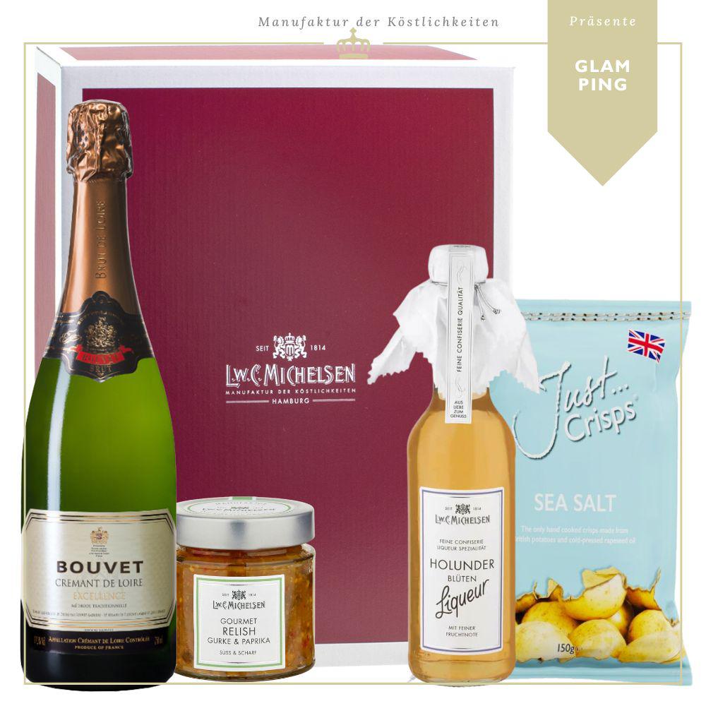 Entdecken Sie unsere exquisite Glamping-Geschenkbox, die jeden Feinschmecker begeistert. Seit 1814 steht unser Hamburger Unternehmen für hochwertige Feinkostprodukte, die weltweit geschätzt werden. Diese besondere Box vereint Tradition und Genuss in einer einzigartigen Auswahl: Ein feiner Crémant von der Loire, der jedem Anlass eine prickelnde Note verleiht, knusprige Chips aus der britischen Manufaktur Just Crisps, Blätterteiggebäck mit Sesam und Mohn, ein pikantes Zwiebelconfit, das Gerichte verfeinert oder als Dip besondere Momente schafft. Gourmet Wasabi Nüsse Red und herrliche Cantuccioni mit Schokoladenstückchen.