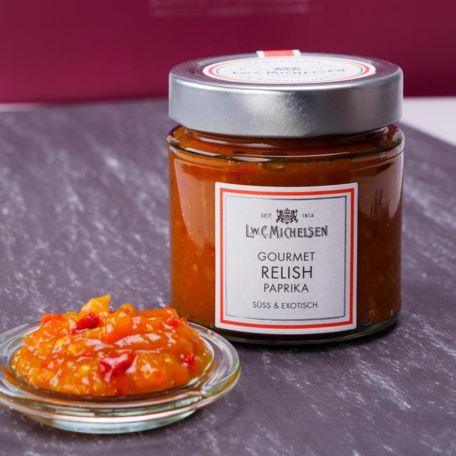 Tauchen Sie ein in die Welt des L.W.C. Michelsen Gourmet Paprika & Curry Relish, ein wahres Meisterwerk der Feinkostkunst.