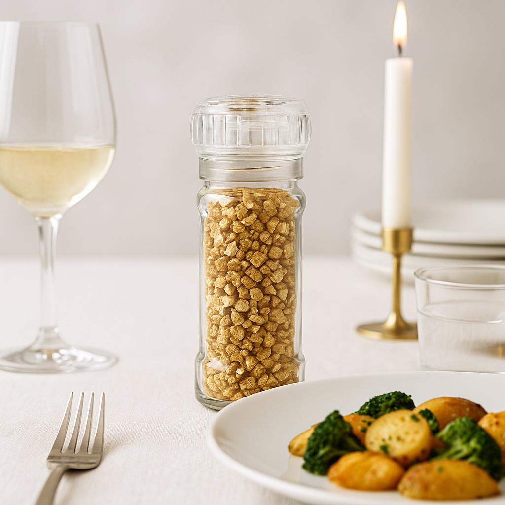 Das Gold-Salz im 4.000 g Vorteilsbag ist die ideale Lösung für alle, die öfter und großzügig kochen. Ob zum Nachfüllen Ihrer Aromamühle oder als praktischer Vorrat für Küche und Gastronomie – dieses grobe Salz mit feinem Goldüberzug setzt glänzende Akzente. Es verleiht Fleisch, Fisch, Gemüse und frischen Salaten eine elegante Note und macht auch bei besonderen Anlässen Eindruck.