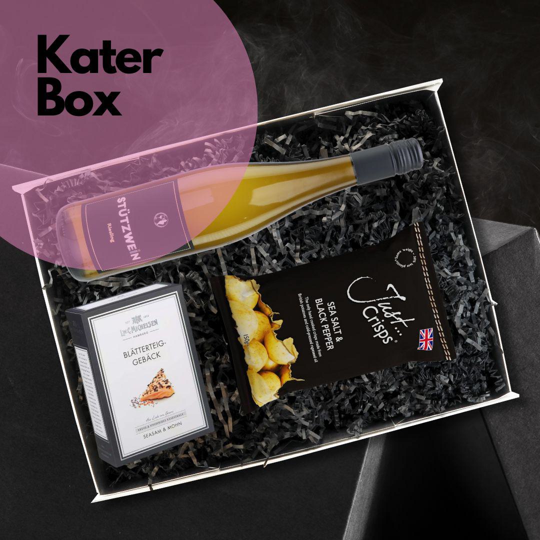 - Die Kater Box Premium: Feinkost-Set mit Weißwein, Blätterteig-Gebäck & Chips.