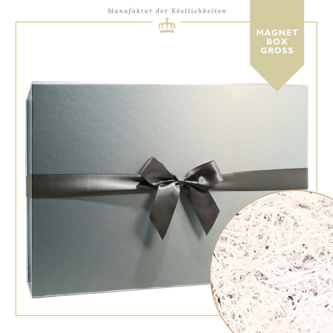 Große silberfarbene Luxus-Magnetbox mit dunkelgrauer Seidenschleife