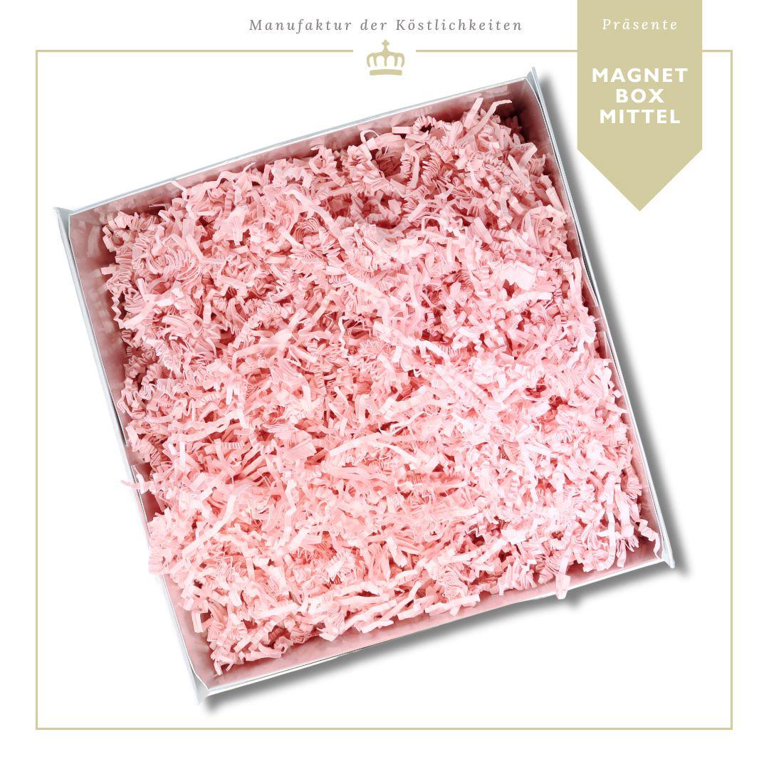 Magnetbox mittlere Größe in Silber mit grüner Seidenschleife und pinkem Füllmaterial