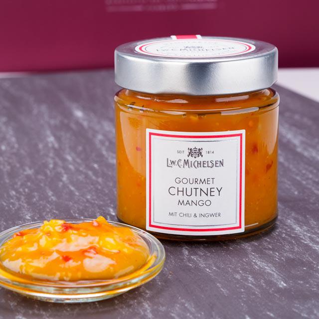 - Fruchtig-pikantes Chutney mit reifen Mango-Stücken, das eine perfekte Balance zwischen Süße und Schärfe bietet.