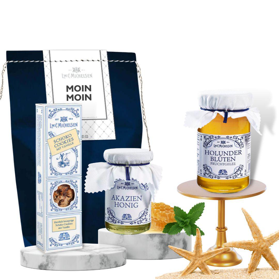 Entdecken Sie das "Moin Moin - Frühstücks" Präsent von L.W.C. Michelsen, ein liebevoll zusammengestelltes Set norddeutscher Spezialitäten. Diese exquisite Geschenktüte enthält knusprige Schoko-Cookies, feinen Akazienhonig und aromatisches Holunderblüten-Gelée. Seit 1814 steht unser Unternehmen für höchste Qualität und Tradition, was sich in jedem unserer Produkte widerspiegelt.
