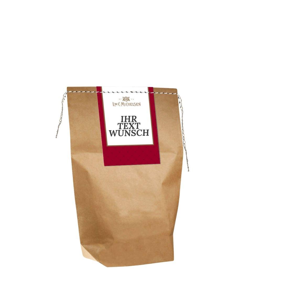 Diese kleine Präsent-Tüte ist wie gemacht für festliche Anlässe. Das warme Braun des zweilagigen Kraftpapiers wird von einer tiefroten Klappkarte mit goldener Folienheißprägung gekrönt – perfekt für Weihnachten oder andere festliche Momente. Die Maße von 14 × 22 × 8 cm eignen sich für kleine, aber feine Genusspräsente: Trüffel, Mini-Liköre oder Honig im Glas. Persönliche Botschaften lassen sich in Schwarz oder Farbe eindrucken, das goldene Logo bleibt stets als elegantes Markenzeichen bestehen.