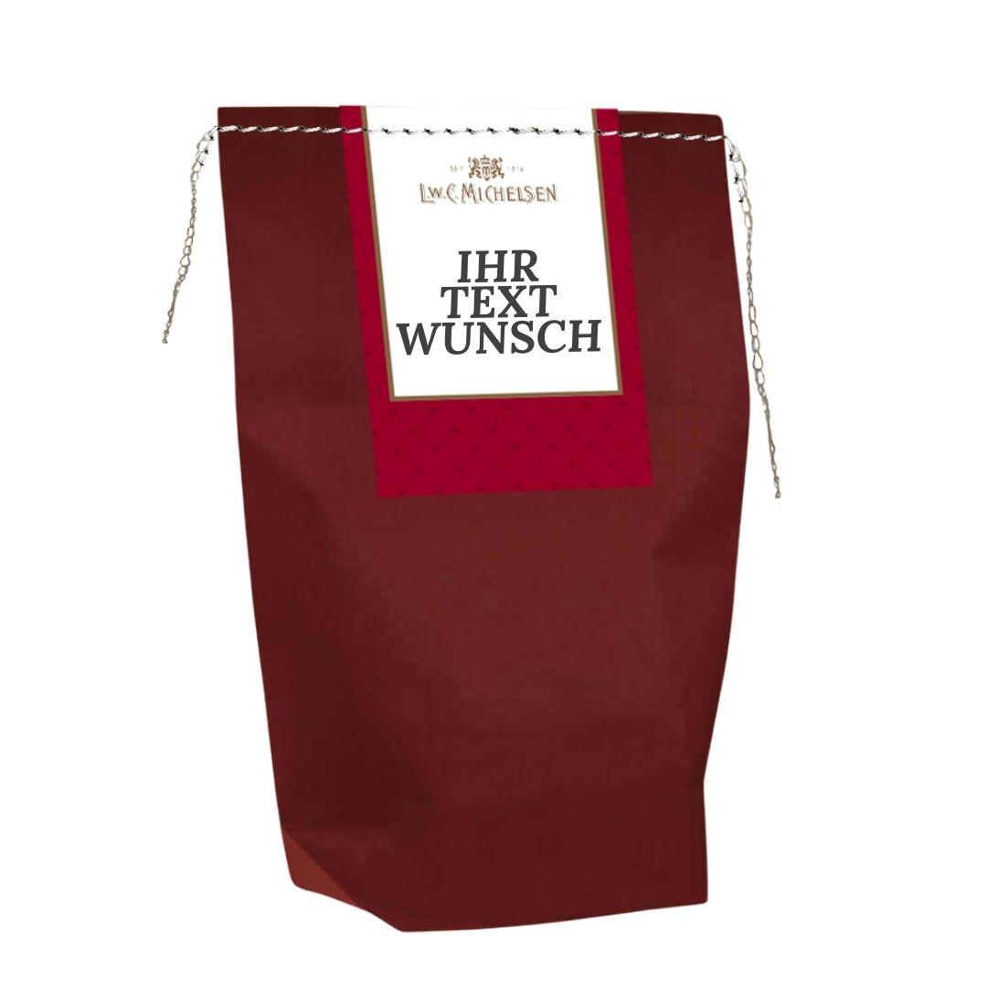 Die mittlere Präsent-Tüte in kräftigem Rot mit dunkelroter Klappkarte wirkt elegant und stilvoll. Die silberne Heißfolienprägung in Handarbeit verleiht der Verpackung eine hochwertige Optik.