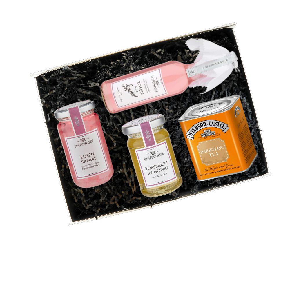 - Unsere Feinkost-Schlemmerbox Statt Blumen enthält vier exquisite Delikatessen: Darjeeling Tee, Rosenduft in Honig, Rosen Kandis und Rosenlikör, die jeden Anlass veredeln.