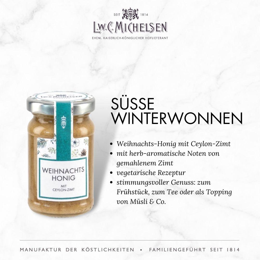 Mit einem breiten Sortiment an exquisiten Feinkostprodukten, Marmeladen, Honigen, Likören und Delikatessen aus aller Welt begeistert L.W.C. Michelsen Feinschmecker, Gourmets und Genießer gleichermaßen. Die Marke steht für traditionelle Rezepturen, hochwertige Zutaten und innovative Geschmackskompositionen, die immer wieder überraschen und Freude bereiten. Auch heute noch werden viele Produkte nach originalen Rezepturen hergestellt – sorgfältig und mit Liebe zum Detail.