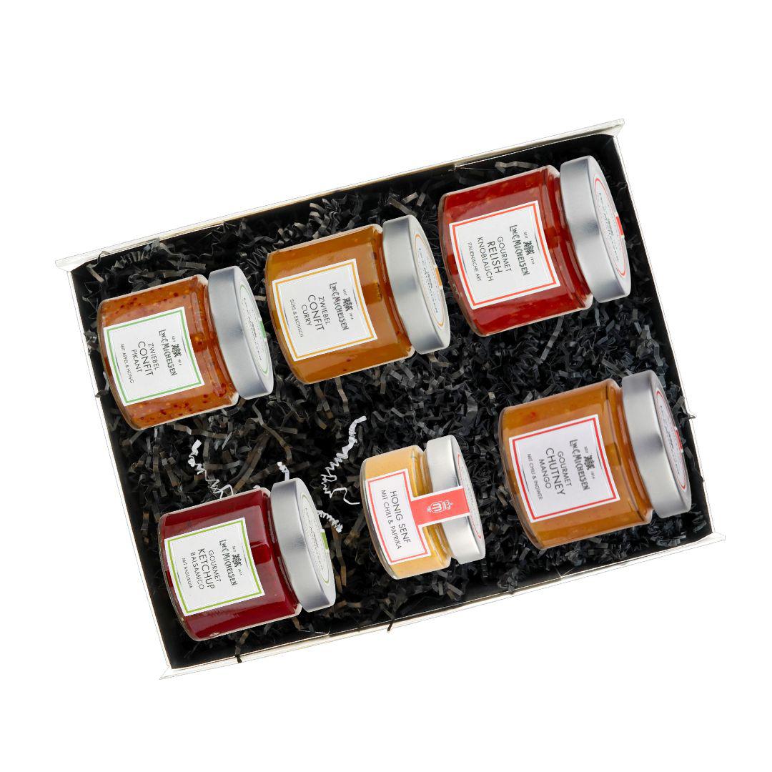 Die Geschenkverpackung ist ein neutraler Bestandteil der Präsentation. Sie wird ausschließlich zur Aufwertung der Feinkost-Komposition eingesetzt und ist nicht für Kinder unter 3 Jahren geeignet. Unsere Lieferanten garantieren die Einhaltung geltender EU-Vorgaben zur Produktsicherheit.